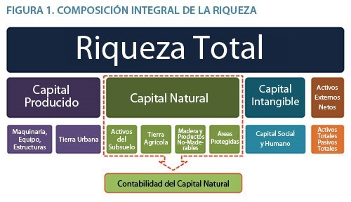 Los países tienen tres tipos de capitales que componen su riqueza total: el capital natural, que puede ser no renovables o renovables; el capital industrial, aquello que se genera y genera el complejo de manufacturas; y el capital intangible, el nivel educativo y de capacitación de recursos humanos.